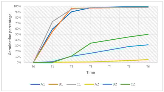 At the germination stage, it was confirmed that a temperature set at 24 ± 1 °C was optimal for seed germination with all three GM exploited [28], with a 16 h photoperiod at an intensity of 70 µmol/m2/s. These conditions promoted the rapid germination of the different seed pools in all three GM (Figure 6); therefore, it has been shown that environmental conditions must be optimal to achieve a high germination rate in a short time [28].