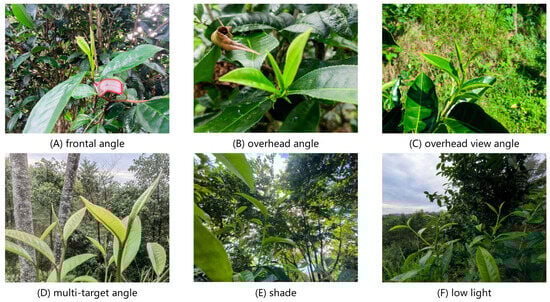 The dataset utilized in this study for tea leaf grading and recognition was gathered through on-site photography in the Xishuangbanna Dai Autonomous Prefecture of Yunnan Province, with a latitude of 21.5 and a longitude of 100.28. The Canon EOS R5, equipped with an RF24-105 mm lens, was employed for image acquisition to ensure the quality and sharpness of the original images. To enhance the adaptability of the detection model to tea leaves under various lighting conditions, angles, and colors [19], a cross-time period and multi-angle image acquisition approach was adopted [20]. Figure 1 displays a selection of the original tea leaf image samples that were collected.