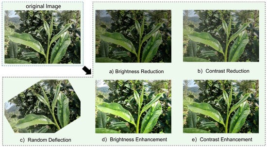 To enhance the model’s applicability in diverse environments, we performed data augmentation operations on the initial tea leaf dataset, as shown in Figure 2 [23]. Specifically, we took the following three steps: First, we adjusted the brightness of the images by increasing it to 1.4 times the original and decreasing it to 0.6 times, achieving a modulation of image brightness [24]. This brightness adjustment helps the model better adapt to complex tea garden environments under different lighting conditions, especially in unstructured settings. Second, we made fine adjustments to the image contrast, increasing it by 1.4 times and decreasing it by 0.6 times [25]. This step aims to enhance the texture, clarity, and grayscale levels of the images, allowing the model to capture a richer array of visual details. Lastly, we increased the diversity of the dataset by randomly rotating the images, which not only enriched the dataset but also strengthened the model’s adaptability for detection at different orientations and angles [26]. After applying the aforementioned techniques of brightness modulation, contrast enhancement, and random rotation for data augmentation, we successfully expanded the initial dataset by six times, increasing from the original 1296 images to 7452. After a rigorous selection process, we ultimately chose 7363 images to construct the final dataset. This process not only improved the quality and diversity of the dataset but also provided a solid foundation for model training and validation.
