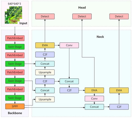 To enhance the accuracy of model detection, reduce computational costs, and increase the flexibility in perceiving target objects, this study implemented enhancements to the YOLOv8 network. Initially, images were proportionally scaled to a standard size of 640 × 640 through the letterbox technique. Thereafter, the Efficient Multi-Scale Attention Module with Cross-Spatial Learning was applied to replace certain parts of the original network structure. Additionally, a Hierarchical Vision Transformer using Shifted Windows was integrated, and the original loss function was optimized with the SloU method. The modified YOLOv8 network structure is illustrated in Figure 3.