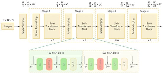 Initially, the image is segmented, with every 4 × 4 adjacent pixels being divided into a block. Subsequently, each block is flattened in the channel direction. During the construction of the feature extraction network, feature maps of varying sizes are generated through four distinct stages. For the second, third, and fourth stages, each stage downsamples the feature dimensions from the preceding stage. After downsampling is completed, the feature maps are passed to a series of block structures for further processing and feature extraction.