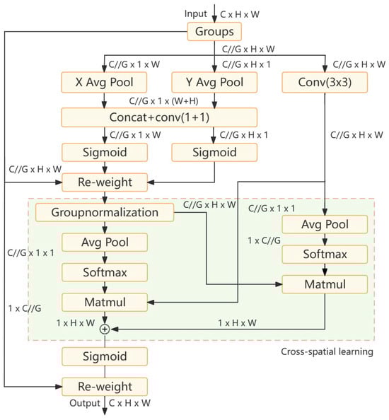 The Efficient Multi-Scale Attention Module with Cross-Spatial Learning primarily consists of a 1 × 1 branch, a 3 × 3 branch, and a Cross-Spatial Learning module. As depicted in Figure 7, the Efficient Multi-Scale Attention Module with Cross-Spatial Learning initially divides the input feature map into G sub-features based on the number of channels, representable as Within the 1 × 1 branch, two one-dimensional global average pooling operations are utilized to encode the channels in the H and W spatial directions, and the two encoded features are concatenated to model cross-channel interaction information. The encoded channel features are then concatenated along the height of the image and shared through a convolution with a kernel size of 1 × 1. The output is decomposed into two vectors along the H and W directions, and a Sigmoid nonlinear function is used to fit the binomial distribution of the two-dimensional bi-linear convolution. After Re-weight adaptive feature variable selection, it serves as the output of the 1 × 1 branch. In the 3 × 3 branch, a single convolution with a kernel size of 3 × 3 is used to extract multi-scale features, which are then output as the 3 × 3 branch’s result.