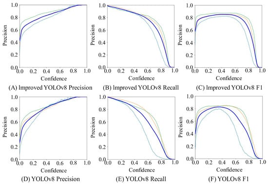 Figure 10 illustrates the significant performance improvements of the improved YOLOv8 model. Specifically, this model has shown marked enhancements in Precision, Recall, and the F1 score—three key metrics—compared with the original YOLOv8 model. The Precision of the improved YOLOv8 reached 83.39%, the Recall rate was 86.99%, and the F1 score stood at 85.15%. These improvements correspond to increases of 3.39%, 0.86%, and 2.20%, respectively, over the original YOLOv8 model. To provide a more intuitive understanding of these data, Figure 10 uses lines of different colors to distinguish the detection results of different types of tea leaves. The light blue line represents the detection performance of single-bud tea leaves, the green line corresponds to one bud with one leaf, and the orange line indicates the detection results for one bud with two leaves. The dark-blue line summarizes the overall performance across all categories, offering a comprehensive perspective on the model’s performance as a whole. These results not only confirm the effectiveness of the improved YOLOv8 in tea leaf-detection tasks but also reflect the model’s good generalization capabilities across different tea leaf categories. Through this detailed visual presentation, we can clearly see the specific performance of the improved YOLOv8 in each category and its progress compared with the original model. Such performance enhancements are of great significance for improving the level of automation and efficiency in tea leaf picking, aiding in the modernization development of the tea industry.