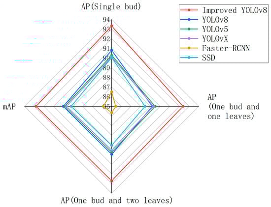 AP is a metric that measures the average Precision of a model’s recognition ability for a specific category across different decision thresholds, reflecting the model’s accuracy in both localization and prediction. According to the presentation in Figure 11, we can observe that the improved YOLOv8 model achieved exceptional performance in tea leaf-detection tasks. Specifically, in the detection of single-bud tea leaves, the AP value of the improved YOLOv8 reached 93.32%, representing a performance increase of 2.52%, 3.04%, 3.19%, 6.82%, and 3.27% over the original YOLOv8 and other mainstream models such as YOLOv5, YOLOX, Faster-RCNN, and SSD. For the detection of one-bud-with-one-leaf tea leaves, the AP value of the improved YOLOv8 was 92.36%, with improvements of 3.16%, 2.87%, 3.05%, 6.94%, and 3.92% over other models. In the detection of one-bud-with-two-leaves tea leaves, the AP value reached 92.72%, with respective improvements of 2.75%, 2.97%, 3.18%, 7.06%, and 3.67% over other models. Overall, the mAP of the improved YOLOv8 was 92.80%, outperforming all models and showing improvements of 2.81%, 2.96%, 3.14%, 6.94%, and 3.62% over the others. These figures not only confirm the efficiency of the improved YOLOv8 in tea leaf-detection tasks but also demonstrate its consistency and reliability in detecting different categories of tea leaves. These performance enhancements are of great significance for improving the automation and Precision of tea leaf picking, contributing to the intelligent development of the tea industry.
