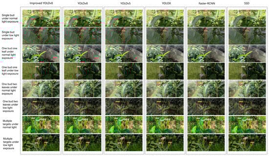 To further validate the superiority of the improved model in this study, the detection of single bud, one bud one leaf, and one bud two leaves in tea plants was conducted under different lighting conditions, single target, and multi-target scenarios. To ensure the reliability of the results, the same dataset was used to train and test the original YOLOv8, YOLOv5, YOLOX, Faster-RCNN, and SSD network models in this study, and the training and testing platforms were consistent. Finally, a comparison was made among the improved YOLOv8, original YOLOv8, YOLOv5, YOLOX, Faster-RCNN, and SSD models trained in this study on the same dataset, as shown in Figure 12. To provide a more objective evaluation of the models, external validation was conducted in the model detection experiments, and the dataset was collected from the tea garden behind Yunnan Agricultural University, with a total of 100 samples. In the figure, Label A represents single bud, Label B represents one bud one leaf, and Label C represents one bud two leaves.