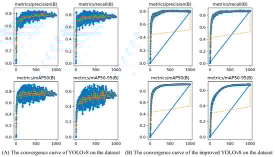 In order to evaluate the convergence performance of the optimized model in the current study on the dataset, a comparison was conducted between the original YOLOv8 model and the enhanced YOLOv8 model. The loss curves depicting bounding box loss, confidence loss, and class loss for both models are depicted in Figure 10. Additionally, an examination of the convergence curves for mAP@0.5, mAP@[0.5:0.95], Accuracy, and Recall is presented in Figure 13. This analysis offers insights into the optimization of the model and its performance on the dataset, highlighting any improvements achieved through enhancements made to the YOLOv8 model.