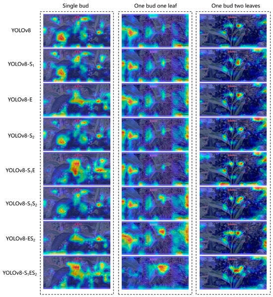 To delve into the performance of the model and explore its potential limitations, this study employed Gradient-weighted Class Activation Mapping (Grad-CAM) technology to visually present the focal areas of the model during the recognition process. Grad-CAM, a visualization method based on the model’s internal features, leverages gradient information from convolutional layers to reveal the parts of the image that the model prioritizes when making decisions. This technique calculates the weights for each channel and overlays this information onto the original image in the form of a heatmap, thereby generating a visual representation of the target area. In this study, as demonstrated in the ablation experiment shown in Figure 14, we applied Grad-CAM technology to generate heatmaps for the YOLOv8-S1ES2 model. These heatmaps intuitively display the key areas the model focuses on when identifying tea leaves. Through comparative analysis, this study found that the heatmaps generated by the YOLOv8-S1ES2 model highly coincide with the actual fresh leaf areas, indicating that the model can accurately identify and concentrate on the critical parts of the image.