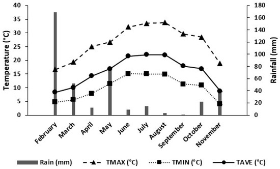 Monthly average precipitation (rainfall) and temperature (minimum—TMIN, average—TAVE, and maximum—TMAX) from January to December 2017 in the orchard.