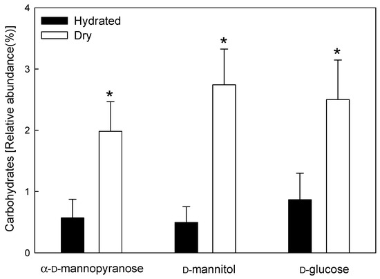Carbohydrate profile [relative abundance (%)] of olive fruits from Cobrançosa trees from the hydrated and dry areas of the orchard. Values are mean ± standard deviation (n = 4). Asterisk (*) indicates significant differences (p ≤ 0.05) between areas.