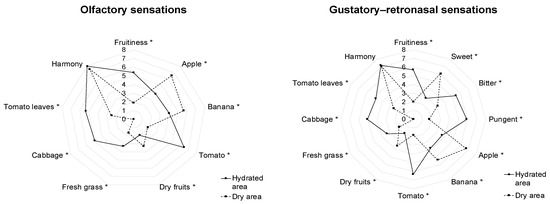 Free acidity, peroxide value, K232, total phenols, and oxidative stability showed no significant differences (p > 0.05) between oils from trees in hydrated and dry areas (Table 2). The coefficient K270 and ∆K increased in olive oil from the dry area (Table 2). Also, in the olive oil from this area, the radical scavenging activity was decreased (Table 2). The trained panel perceived 9 olfactory sensations and 12 gustatory-retronasal sensations (Figure 3). Olive oils from the dry area showed higher olfactory sensation scores of “apple”, “banana”, and “dry fruits” in relation to oils from the hydrated area. Other olfactory sensations like “fruitiness”, “tomato”, “tomato leaves”, and “green” were less perceived in the dry-area oils. The olfactory sensation of “cabbage” was not found in oils from the dry area plants. Harmony was similar (p > 0.05) in oils from both areas. As for olfactory sensations, attributes like “apple”, “banana”, and “dry fruits”, as well as “sweet” in gustatory-retronasal sensations, showed higher values in olive oils extracted from the dry-area trees. These olive oils also showed lower gustatory-retronasal sensations of fruitiness, bitterness, pungency, green tomato, and tomato leaves compared to olive oils from the hydrated-area plants. Also, oils from the dry area showed no gustatory-retronasal sensation of cabbage. Harmony was similar (p > 0.05) in oils from both areas. Concerning the olfactory-gustatory sensations, oils showed significant differences in complexity and persistence. The hydrated-area oils were evaluated as 7.46 ± 0.35, while dry-area oils were 6.56 ± 0.44 in complexity. Regarding persistency, hydrated-area oils were evaluated as 8.28 ± 0.42, while those from the dry area were 7.84 ± 0.37.