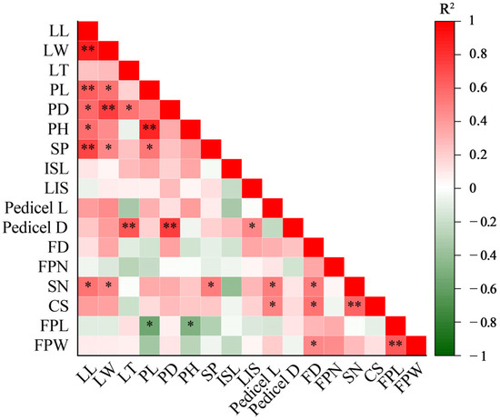 Correlation analysis was conducted among 17 quantitative traits of 18 strawberry germplasms. The asterisk (*) denotes significance at p ≤ 0.05, while the double asterisk (**) indicates significance at p ≤ 0.01. The analyzed traits include the following: LL (leaf length), LW (leaf width), LT (leaf thickness), PL (petiole length), PD (petiole diameter), PH (plant height), SP (size of plant), ISL (inflorescence stalk length), LIS (inflorescence stalk thickness), Pedicel L (pedicel length), Pedicel D (pedicel diameter), FD (flower diameter), FPN (flower petal number), SN (stamen number), CS (calyx size), FPL (flower petal length), and FPW (flower petal width).