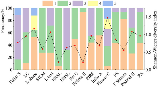 Frequency distribution of variant types and the Shannon–Wiener diversity index of 16 quality traits in 18 strawberry germplasms. These red dots represent the Shannon–Wiener diversity index for each of the 16 quality traits. Numbers 1 to 5 represent the values assigned to various quality traits. Please refer to Table 1 for the code names of the 18 strawberry germplasms. The analyzed traits include the following: Foliar S (foliar state), LC (leaf color), L shape (leaf shape), SILM (shape of incisions of leaf margin), L text (leaf texture), HRSL (hair on the right side of the leaf), HBSL (hair on the back side of the leaf), Pet C (petiole color), Petiole H (petiole hair), PIRF (position of inflorescence relative to foliage), Inflo A (inflorescence architecture), Flower C (flower color), PS (petal shape), P Stamen (position of stamen), Pedicel H (pedicel hair), and PA (plant architecture).