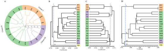At a similarity coefficient of 0.77, the 18 strawberry germplasms were categorized into three major clusters based on CDDP molecular marker data (Figure 5C). Cluster I includes three species (lines) aligning with Cluster I in the ISSR molecular marker-based clustering results. Cluster II comprises ‘Zijinhong’, ‘Zijindaiyu’, and ‘Tokun’. Cluster III includes 12 species (lines), which corresponds to Class II of the ISSR molecular marker-based clustering results. Notably, the phenotype-based clustering results differed significantly from those based on molecular markers. However, the clustering results obtained from ISSR and CDDP were largely consistent across the three major clusters, with discrepancies noted in the clustering outcomes of the minor clusters.