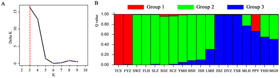 The bands were counted based on the PCR amplification results of ISSR and CDDP markers. Clear bands at the same site were recorded as ‘1’, while the absence of bands was recorded as ‘0’, resulting in the establishment of a ‘0–1’ data matrix. The number of amplified bands, the number of polymorphic bands, and the percentage of polymorphic loci for each primer were calculated using Excel. Genetic similarity coefficients, the number of observed alleles, the number of effective alleles, Nei’s diversity index (H), and Shannon’s diversity index (I) for the 18 strawberry varieties (lines) were computed using PopGene 1.32 software [26]. Unweighted Pair Group Method Using Arithmetic Average (UPGMA) cluster analysis was performed based on DICE similarity coefficients using NTSYSpc 2.10e software [26,32,33]. Using the ISSR + CDDP data, the K value was determined with Structure 2.3.4 software. Subsequently, the corresponding Q value for each strawberry germplasm was calculated to analyze the population genetic structure of the strawberry germplasm resources and ascertain the genetic composition of each germplasm resource. The layout of the resulting image was performed using Adobe Photoshop 2023.