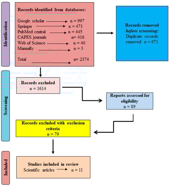 Database searches were conducted to select and extract articles. The databases used were CAPES journals (https://www.periodicos.capes.gov.br, accessed on 30 March 2024), PubMed Central (https://www.ncbi.nlm.nih.gov/pmc), Springer (https://link.springer.com, accessed on 30 October 2024), and Web of Science (https://www.webofscience.com/wos/woscc/basic-search, accessed on 30 October 2024). The Google Scholar website (https://scholar.google.com.br, accessed on 30 October 2024) was also used for our search. The websites were accessed in October 2024. The selected files were imported in BIBITEX and MEDILINE format compatible with StArt software-version Beta 3.0.3. In the search strings, connectors such as “AND” and “OR” were used to group synonymous keywords and main topics.