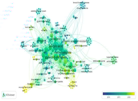 The terms salicylic acid, methyl salicylate, and glycerol-3-phosphate were the most frequent and were related to azalaic acid, accumulation, genes, and systemic acquired resistance; in addition, they were related to the terms application of glycerol, oleic acid, and mutant Arabidopsis ssi2.