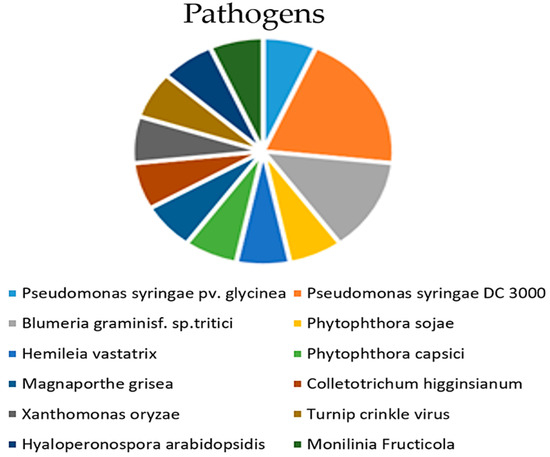 The studies carried out in Japan were on soybean and rice crops, the main foods that are part of the diets of humans and animals [28,29]. In the rice crop, the pathogens Magnaporthe grisea (race 007.0) and Xanthomonas oryzae (strain T7174) were studied, and, in the soybean crop, Pseudomonas syringae DC 3000.