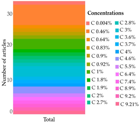 Different concentrations of glycerol were used for resistance induction in the selected articles. Four used only a single concentration, 3%, 1%, or 0.46%; the last one was used in two studies. The other articles used two glycerol concentrations ranging from 0.004 to 9.21% (Figure 6).