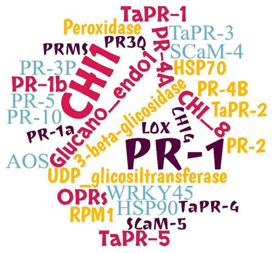 A word cloud with the genes related to plant resistance using glycerol was created, where the size of the name of each gene indicates the number of articles that describe the expression of the gene (Figure 7). The most commonly reported genes expressed in response to glycerol were PR-1, CHI1, TAPR-1, PR-5, SCAM-5, Udp-glycosyltransferase, chitinase-1, and LOXA.