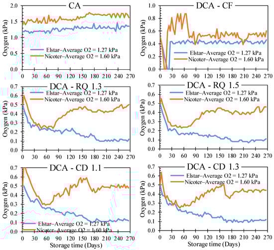 After the sampling process, fruit was cooled to 5 °C, maintained for one week and thereafter cooled down to the storage temperature, 3 °C for ‘Nicoter’ and 1 °C for ‘Elstar’. These two storage temperatures were based on the recommendations for both cultivars. The fruit was stored in 250 L chambers. These chambers were gas-tight to allow the application of CA and DCA conditions. The storage conditions tested for both cultivars were (1) CA; (2) dynamic controlled atmosphere based on chlorophyll fluorescence (DCA-CF); (3) dynamic controlled atmosphere based on respiratory quotient 1.3 (DCA-RQ 1.3); (4) DCA-RQ 1.5; (5) dynamic controlled atmosphere based on carbon dioxide (DCA-CD 1.1); and (6) DCA-CD 1.3. All the storage conditions were without and with 1-MCP treatment (650 ppb). The CO2 partial pressures were 2.0 and 1.0 kPa for CA stored ‘Elstar’ and ‘Nicoter’ apples, respectively. For DCA, the CO2 partial pressures were 1.2 and 1.0 kPa for ‘Elstar’ and ‘Nicoter’ apples, respectively. Each chamber was connected to an automatic CA control system (Isollcel®, Bolzano, Italy) to continuously control the atmosphere inside the chambers. The oxygen partial pressure variation for both cultivars and storage conditions are shown in Figure 1.