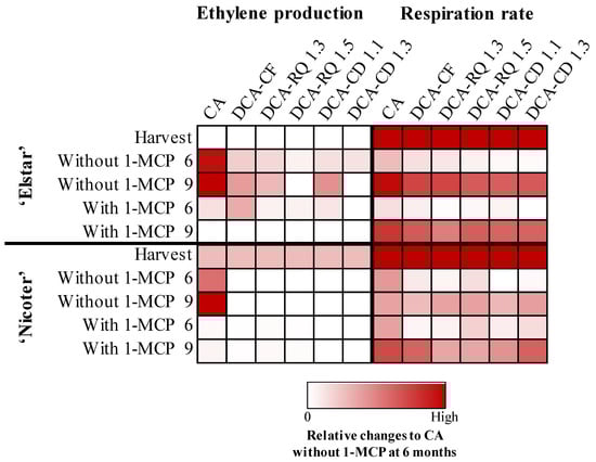 Heat map showing the relative changes for ethylene production and respiration rates of ‘Elstar’ and ‘Nicoter’ apples after harvest, at 6 and 9 months of storage under controlled atmosphere (CA) and dynamic controlled atmosphere monitored by chlorophyll fluorescence (DCA-CF), respiratory quotient (DCA-RQ) and carbon dioxide (DCA-CD), either without or with 1-MCP treatment (650 ppb), plus 7 d of shelf life at 20 °C.