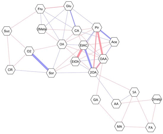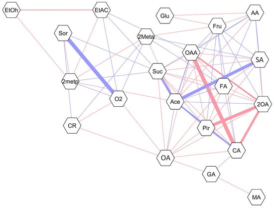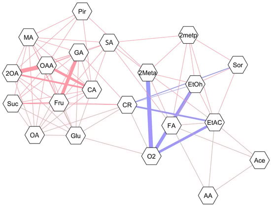 Correlation network for ‘Nicoter’ apples after 9 months of storage under controlled atmosphere (CA) and dynamic controlled atmosphere monitored by chlorophyll fluorescence (DCA-CF), respiratory quotient (DCA-RQ) and carbon dioxide (DCA-CD), either without or with 1-MCP treatment (650 ppb), plus 7 d of shelf life at 20 °C. Blue and red lines show negative and positive correlation, respectively. The sizes of the lines show the correlation magnitude (all correlations shown are higher than 0.5). Suc: sucrose; Glu: glucose; Fru: fructose; Sor: sorbitol; Pir: pyruvate; Ace: acetaldehyde; EtOH: ethanol; EtAC: ethyl acetate; AA: acetic acid; CA: citrate; 2OA: 2-oxoglutarate; GA: glutamate; SA: succinate; FA: fumarate; MA: malate; OAA: oxaloacetate; OA: oxalate; 2metp: 2-methylpropanol; 2meta: 2-methylpropyl acetate; CR: carbon release.