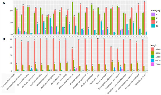 The most common long repeats were 30–40 bp in length, ranging from 28 occurrences in Pal. formosanum and Sar. laurinum to 41 in P. grandifolia, Additionally, the greatest number of 40–50 bp repeats was found in Pal. formosanum. Repeats of 50–60 bp were present in 17 species, occurring 1 to 3 times. Repeats in the 60–70 bp range were found only in E. aurata, Sar. arboreum, and Sar. laurinum, while repeats of 70–80 bp were observed in Pal. formosanum and Sar. laurinum (Figure 1B, Table S7).