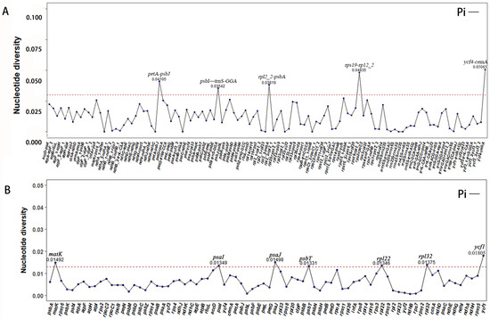 Comparison of nucleotide diversity among Sapotaceae species: (A) intergen-ic spacers (IGS); (B) the protein coding sequences (CDS).