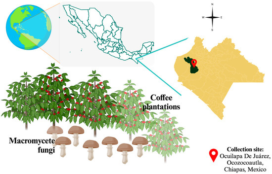 Specimens of macromycete fungi were collected during the summer season (July 2022) from coffee plantations located in Ocuilapa de Juárez (16°51′05.4″ N, 93°25′29.5″ W, altitude: 820 masl) in the municipality of Ocozocoautla de Espinosa, Chiapas, Mexico (Figure 1). The soils in the area are of the vertisol type, dark brown in color, shallow, and with good moisture content. The region experiences an average annual precipitation of 1000 to 1200 mm and an average temperature of 22 °C. The vegetation mainly consists of sub-perenifolium tropical forest, with occasional fragments of perennifolia tropical forest and montane mesophilic forest.