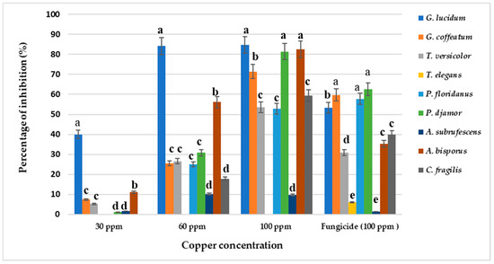 The percentage of fungal mycelial growth inhibition by different copper concentrations. Mean values of three replicates. Means followed by the same letter are non-significantly different (Tukey test, p < 0.05).