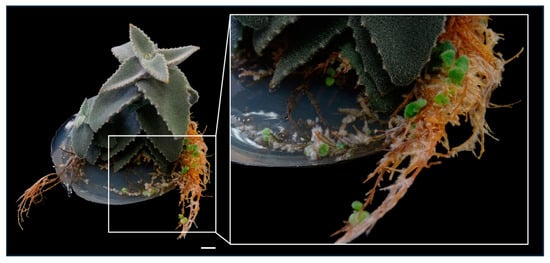 Axenic plant of K. beharensis cultured on hormone-free medium (i.e., BM) for 60 days (left). Notice the development of adventitious shoots emerging from the roots (right). Scale bars: 1 cm.