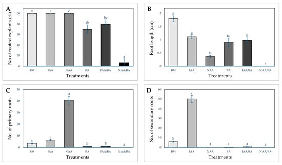 Root development from leaf explants. Results were recorded after 30 days of culture in the different treatments. (A) Percentage of explants developing roots. (B) Length of developed roots. (C) Mean number of primary roots per explant. (D) Mean number of secondary roots per explant. Data are means ± SE. Different letters indicate statistically significant differences (p ≤ 0.05, Kruskal–Wallis test).