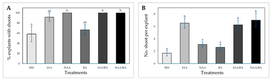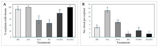 Shoot development from leaf explants. Results were recorded after 30 days of culture in the different treatments. (A) Percentage of explants that develop shoots. (B) Number of shoots per explant. Data are means ± SE. Different letters indicate statistically significant differences (p ≤ 0.05, Kruskal–Wallis test).