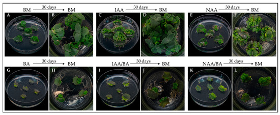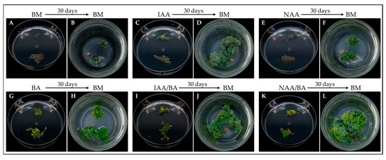 Root and bud induction from leaves after 30 days of culture on BM, IAA, NAA, BA, IAA/BA, and NAA/BA media (A,C,E,G,I,K), and shoot development after 30 days of culture on hormone-free medium (i.e., BM medium) (B,D,F,H,J,L).