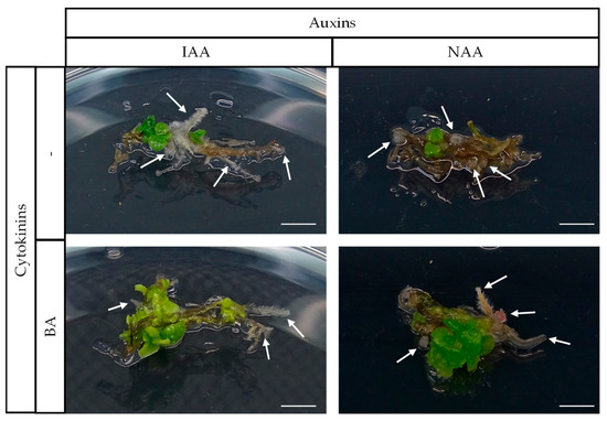 As in the experiment with leaf explants, root explants cultured in the different culture media were transferred to hormone-free medium to promote the elongation of adventitious shoots. After 30 days of culture on this medium, the number of shoots developed per root cluster was evaluated. In contrast to what was observed with leaf explants, the root explants grown on cytokinin-containing media (i.e., BA, IAA/BA or NAA/BA) showed the best performance in shoot production, significantly outperforming shoot development on the other culture media (Figure 7B and Figure 8). However, it should be noted that the shoots obtained were much smaller than those obtained from leaf explants (Figure 4 vs. Figure 8).