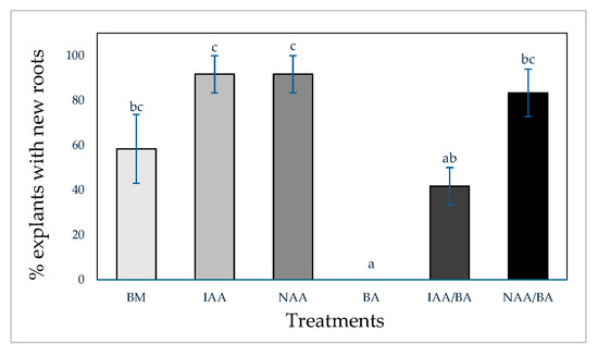 Root development from root explants. Results were recorded after 30 days of culture in the different treatments. Data are means ± SE. Different letters indicate statistically significant differences (p ≤ 0.05, Kruskal–Wallis test).