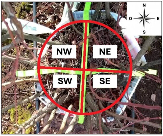 Schematic representation from a top view of a blueberry plant, showing the four quadrants (Northwest -NW-, Southwest -SW-, Northeast -NE-, Southeast -SE-).