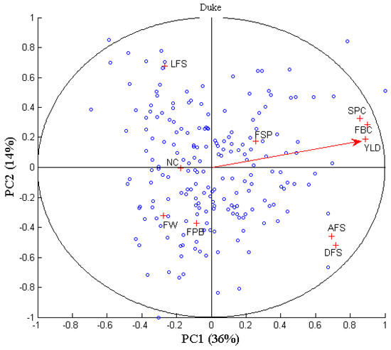 Scatter plot of the principal components analysis on ‘Duke’ (first two principal components). Blue circles represent the observations (total number of canes per plant, n = 197); red crosses are the study variables, and the red arrow denotes the principal yield variable. Length of the first shoot (LFS), diameter of the first shoot (DFS), flower buds per cane (FBC), shoots per cane (SPC), flowers per bud (FPB), fruit weight (FW), fruit set percentage (FSP), number of canes (NC), age of the first shoot (AFS), and yield (YLD).