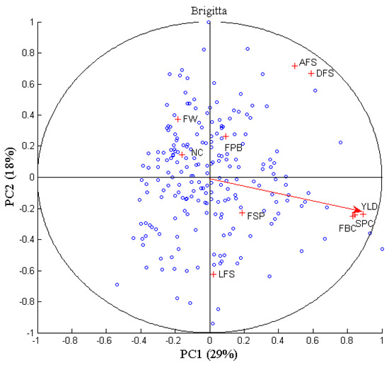 Scatter plot of the principal components analysis on ‘Brigitta’ (first two principal components). Blue circles represent the observations (total number of canes per plant, n = 211); red crosses represent the variables, and the red arrow denotes the principal yield variable. Length of the first shoot (LFS), diameter of the first shoot (DFS), flower buds per cane (FBC), shoots per cane (SPC), flowers per bud (FPB), fruit weight (FW), fruit set percentage (FSP), number of canes (NC), age of the first shoot (AFS), and yield (YLD).