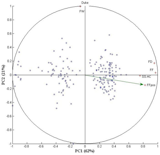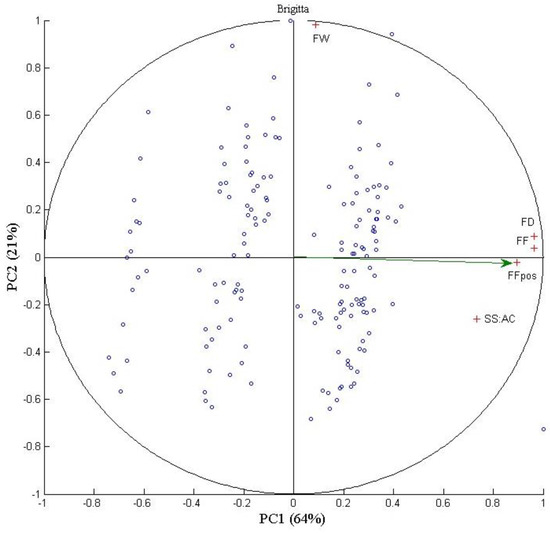 Principal Component Analysis performed on ‘Brigitta’. Fruit firmness after harvest (FFpos), fruit firmness (FF), fruit weight (FW), fruit diameter (FD), and ratio soluble solids/acidity (SS:AC). Scatter plot of the principal components analysis on Duke (first two principal components). Blue circles represent the observations (fruits); red crosses are the study variables, and the green arrow denotes the principal quality variable (fruit firmness after harvest).