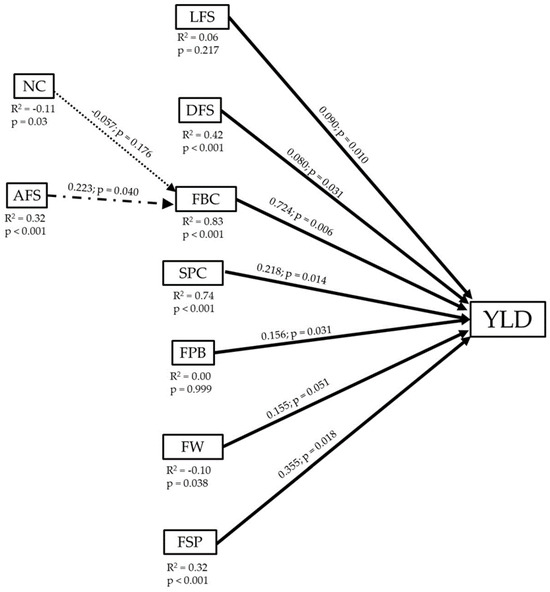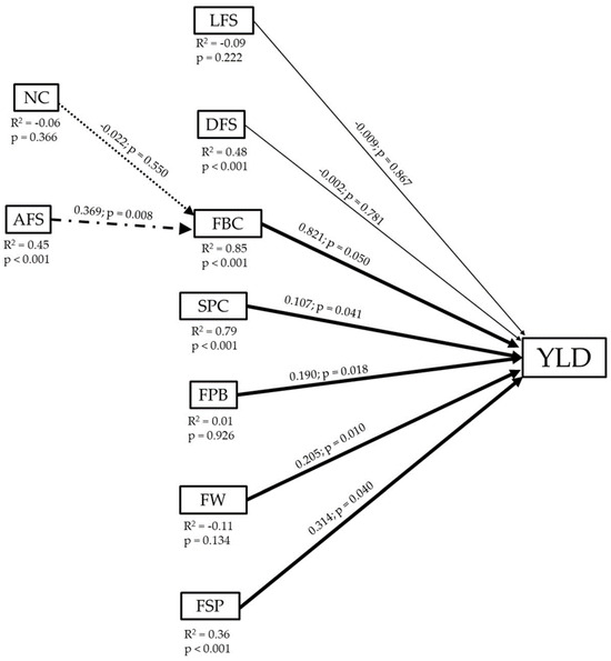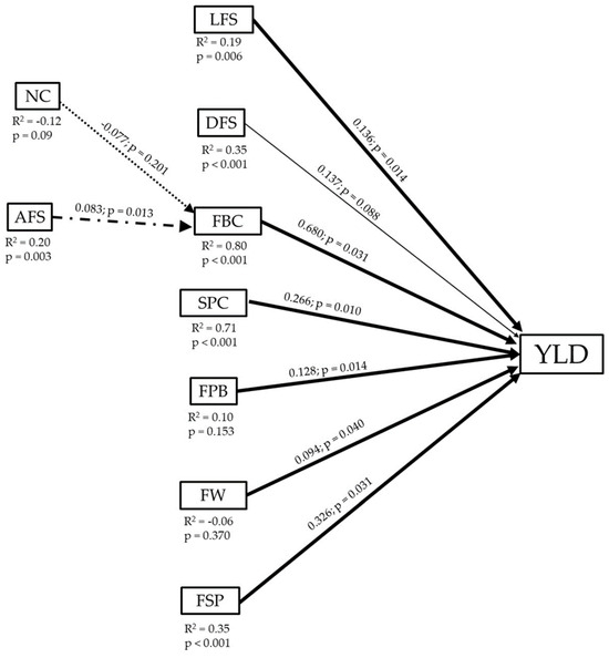 Path Analysis of the relationships between yield (YLD) of V. corymbosum ‘Brigitta’ with length of the first shoot (LFS), diameter of the first shoot (DFS), flower buds per cane (FBC), shoots per cane (SPC), flowers per bud (FPB), fruit weight (FW), fruit set percentage (FSP), number of canes (NC), and age of the first shoot (AFS). Thick arrows indicate significant direct effects and thin line no significant direct effects (solid lines); and thick dashed arrows significant indirect effects and thin dashed arrows no significant indirect effects (dashed lines). Above the arrows, the path coefficient and its statistical significance are presented. Below, each causative variable represents the total correlation (R2) and significance between that variable and YLD.