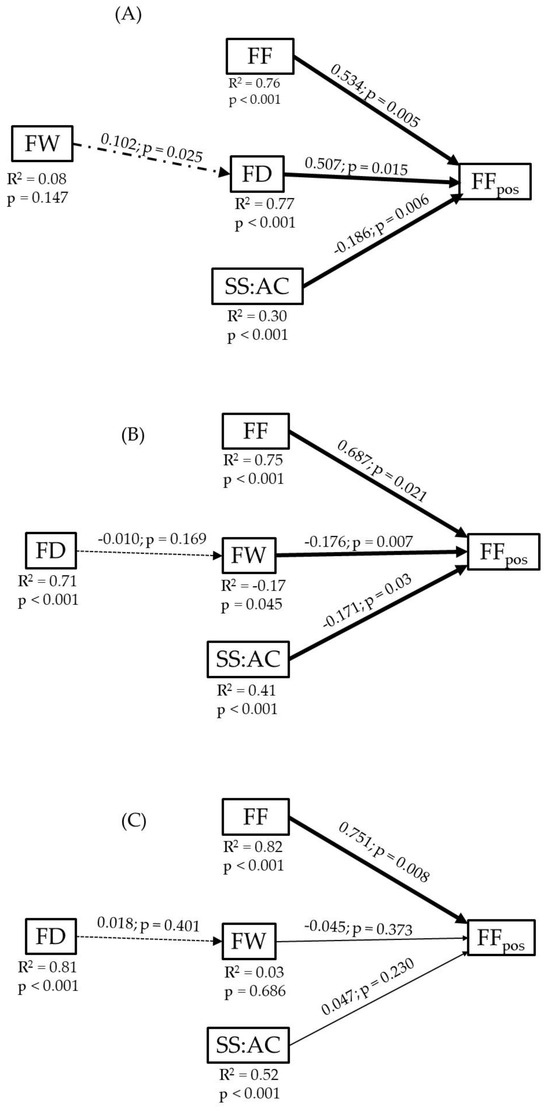 Path Analysis of the relationships between fruit firmness after harvest (FFpos) of V. corymbosum with fruit firmness (FF), fruit weight (FW), fruit diameter (FD), and ratio soluble solids/acidity (SS:AC). (A) Pooled data, (B) ‘Duke’, (C) ‘Brigitta’. Thick arrows indicate significant direct effects (solid lines) and indirect effects (dashed lines). Thick arrows indicate significant direct effects and thin line no significant direct effects (solid lines); and thick dashed arrows significant indirect effects and thin dashed arrows no significant indirect effects (dashed lines). Above the arrows, the path coefficient and its statistical significance are presented. Below, each causative variable represents the total correlation (R2) and significance between that variable and FFpos.