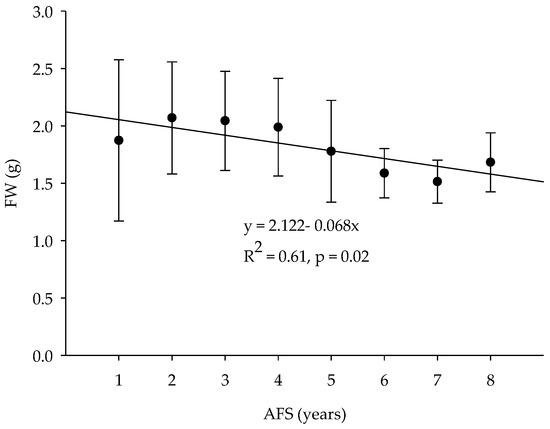 Relationship between fruit weight (FW) and the age of the first segment (AFS). Each point represents the average of FW and AFS for both cultivars (n = 518). Black bars represent the standard error. Black line is the trend line of the model.
