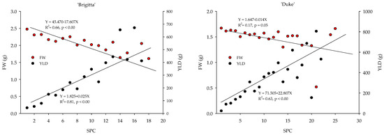 There was a negative and significant relationship between fruit weight (FW), the age of the first shoot (AFS), and the number of one-year shoots per cane (SPC) in both ‘Duke’ and ‘Brigitta’ (Figure 10 and Figure 11). As expected, the relationship between FW and YLD was positive and significant in both cultivars (Figure 11).