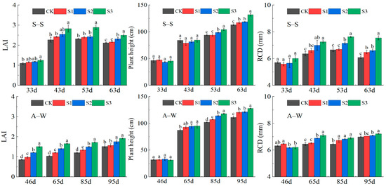 At the end of the seedling stage, three plants with good growth were randomly selected and marked for each plot to observe the later plant growth. Plant height was measured using a steel tape measure (stem base to top of natural growth point); root collar diameter using a digital vernier caliper (base stem diameter); and leaf area index using a canopy analyzer (LAI-2200C, LI-COR, Lincoln, NE, USA). Plant height, stem thickness, and leaf area index (LAI) were measured once every 10 days. At each growth stage, the leaf net photosynthetic rate (A), stomatal conductance (gsw), intercellular CO2 concentration (Ci), transpiration rate (E), and leaf temperature (Tleaf) were measured using a portable photosynthesizer (LI-6800, LI-COR, Lincoln, NE, USA). The times of observation of the plant photosynthetic characteristics were from 9:00 am to 10:00 am on 30 May 2019 (S–S) and 15 November 2019 (A–W), respectively. The chlorophyll content of the labeled leaves was measured using a chlorophyll meter (SPAD-502, Minolta, Osaka, Japan) at 10-day intervals.