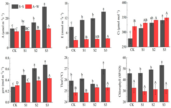The improvements in the soil water, fertilizer, and air environment are conducive to creating a suitable root zone environment, which provides strong conditions for crop roots to absorb soil water and nutrients and, in turn, provides a constant supply of raw materials for photosynthesis in the aboveground part of the crop, enhancing the chlorophyll content and photosynthetic capacity of the plant (Figure 4). In this study, the A of S3 increased by 112.89% (17.68%) in S–S (A–W). Conversely, soil salinity reduces the effectiveness of soil water, causing physiological drought in crops, and to prevent water loss in leaves and maintain a higher osmotic water potential in leaves, plants inhibit transpiration by reducing stomatal opening. This, at the same time, prevents the entry of CO2 into the leaf flesh cells to participate in photosynthesis, directly leading to a decrease in photosynthetic efficiency [59]. However, the structure of the plant membrane system is damaged under salt stress, reducing the efficiency of protein synthesis and the accumulation of excessive harmful metabolites in the plant, ultimately affecting chlorophyll formation and photosynthetic capacity.