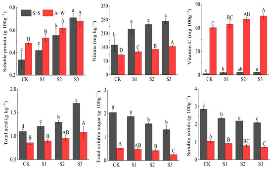 Effect of MIW on the fruit quality of greenhouse fruit cucumber. Different lowercase letters in the graph represent significant differences (p < 0.05) between treatments in spring–summer (S–S), and different uppercase letters represent significant differences (p < 0.05) between treatments in autumn–winter (A–W).