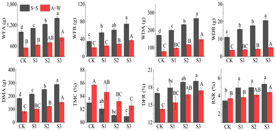 Effect of MIW on the plant biomass of greenhouse fruit cucumber. Different lowercase letters in the graph represent significant differences (p < 0.05) between treatments in spring−summer (S–S), and different uppercase letters represent significant differences (p < 0.05) between treatments in autumn−winter (A–W).