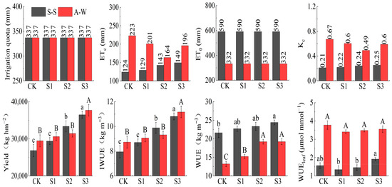 Effect of MIW on the yield, IWUE, and WUE of greenhouse fruit cucumber. Different lowercase letters in the graph represent significant differences (p < 0.05) between treatments in spring–summer (S–S), and different uppercase letters represent significant differences (p < 0.05) between treatments in autumn–winter (A–W).