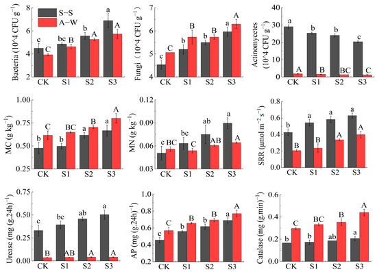 The soil microorganisms (soil bacteria, fungi, SRR), microbial carbon and nitrogen (MC, MN), and enzyme activities (urease, AP, catalase) increased with decreasing MIW (CK < S1 < S2 < S3). Actinomycetes decreased with decreasing MIW (CK > S1 > S2 > S3) in both seasons of the experiment (Figure 8). Compared to the control CK, the soil bacteria, fungi, and soil respiration rate (SRR) of S3 increased in S–S (A–W) by 3.53% (46.15%), 33.33% (23.53%), and 46.51% (90.48%), respectively. The microbial carbon (MC) and microbial nitrogen (MN) increased by 39.58% (21.95%) and 76.47% (69.23%), respectively. Urease, alkaline phosphatase (AP), and catalase increased by 51.52% (16.67%), 50.00% (35.09%), and 23.53% (36.67%), respectively, and actinomycetes decreased by 30.00% (33.33%). Apparently, S1, S2, and S3 differed from CK to different degrees in the two seasons of the experiment, with S3 differing significantly from CK (p < 0.05), and MIW had highly significant effects on soil bacteria, fungi, actinomycetes, SRR, and AP (p < 0.01).